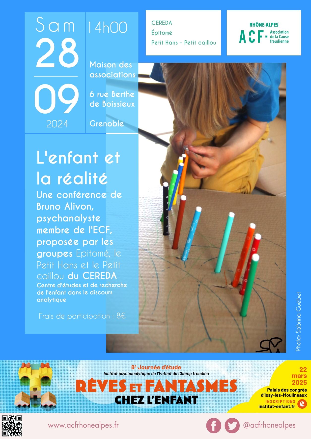 Occuper cette place, pour un(e) praticien(ne), régler son intervention au plus près de la parole de l’enfant et de ce dont il s’agit pour lui, ne se fait pas sans soulever difficultés et interrogations. S’orienter de la psychanalyse, ancrer sa pratique dans une éthique de la singularité requiert une mise au travail avec d’autres. C’est ce que proposent les groupes du CEREDA, Centre d’Étude et de Recherche pour l’Enfant dans le Discours Analytique, inscrits dans les réseaux « Enfance » du Champ freudien et composante de l’Institut psychanalytique de l’Enfant. À partir des concepts fondamentaux de la psychanalyse, et en lien avec la clinique actuelle de l’enfant et de l’adolescent, le CEREDA est un lieu où peuvent s’élaborer les questions cruciales de la pratique – qu’elle en soit à ses tout débuts ou déjà plus avancée ; qu’elle s’exerce en cabinet libéral ou dans des lieux de consultation publics et associatifs.