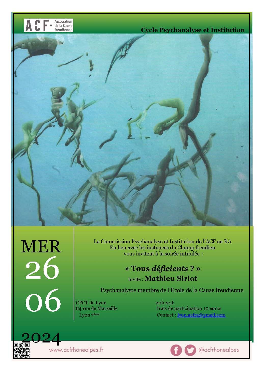 Après une première série du cycle d’échanges cliniques, un second cycle s’ouvre avec prochainement avec pour invité Mathieu SIRIOT, membre de l’ECF et de l’AMP sous le titre des échanges cliniques : Tous déficients ?